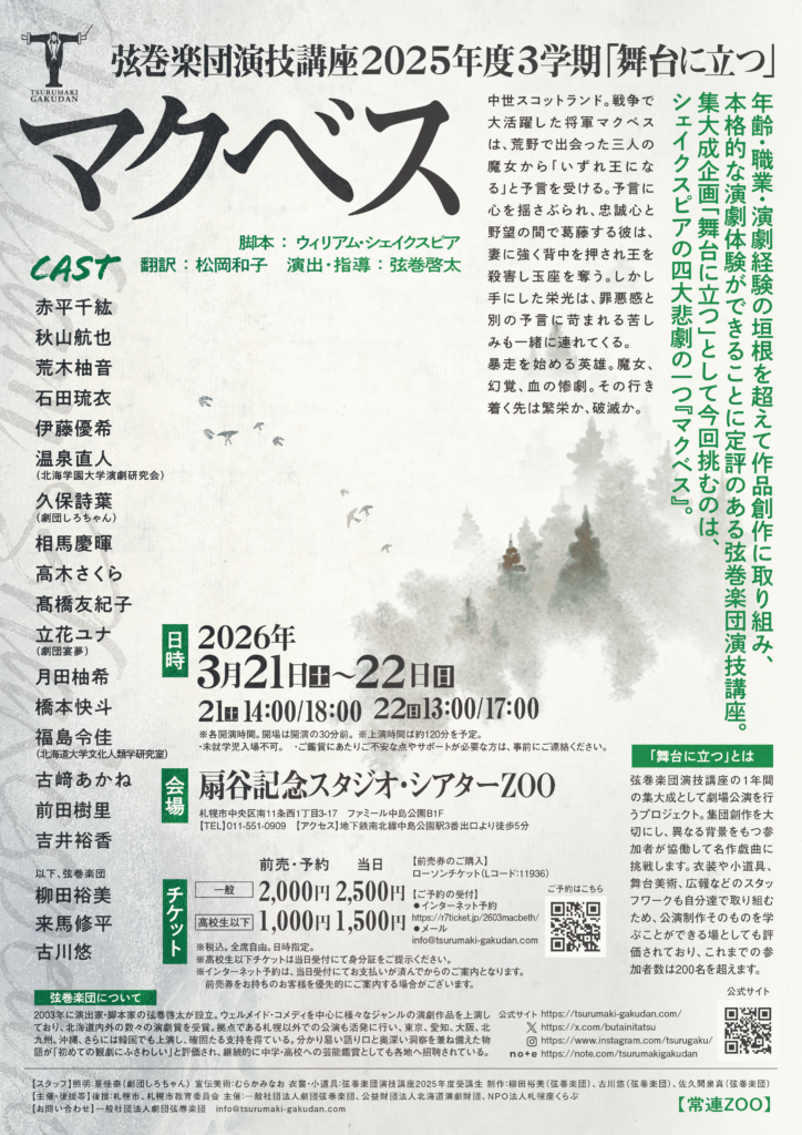 毎年恒例の弦巻楽団演技講座シェイクスピア・シリーズ。2025年度に挑んだのは、シェイクスピアの四大悲劇の一つ『マクベス』。暴走を始める英雄。魔女、幻覚、血の惨劇。その行き着く先は繁栄か、破滅か。